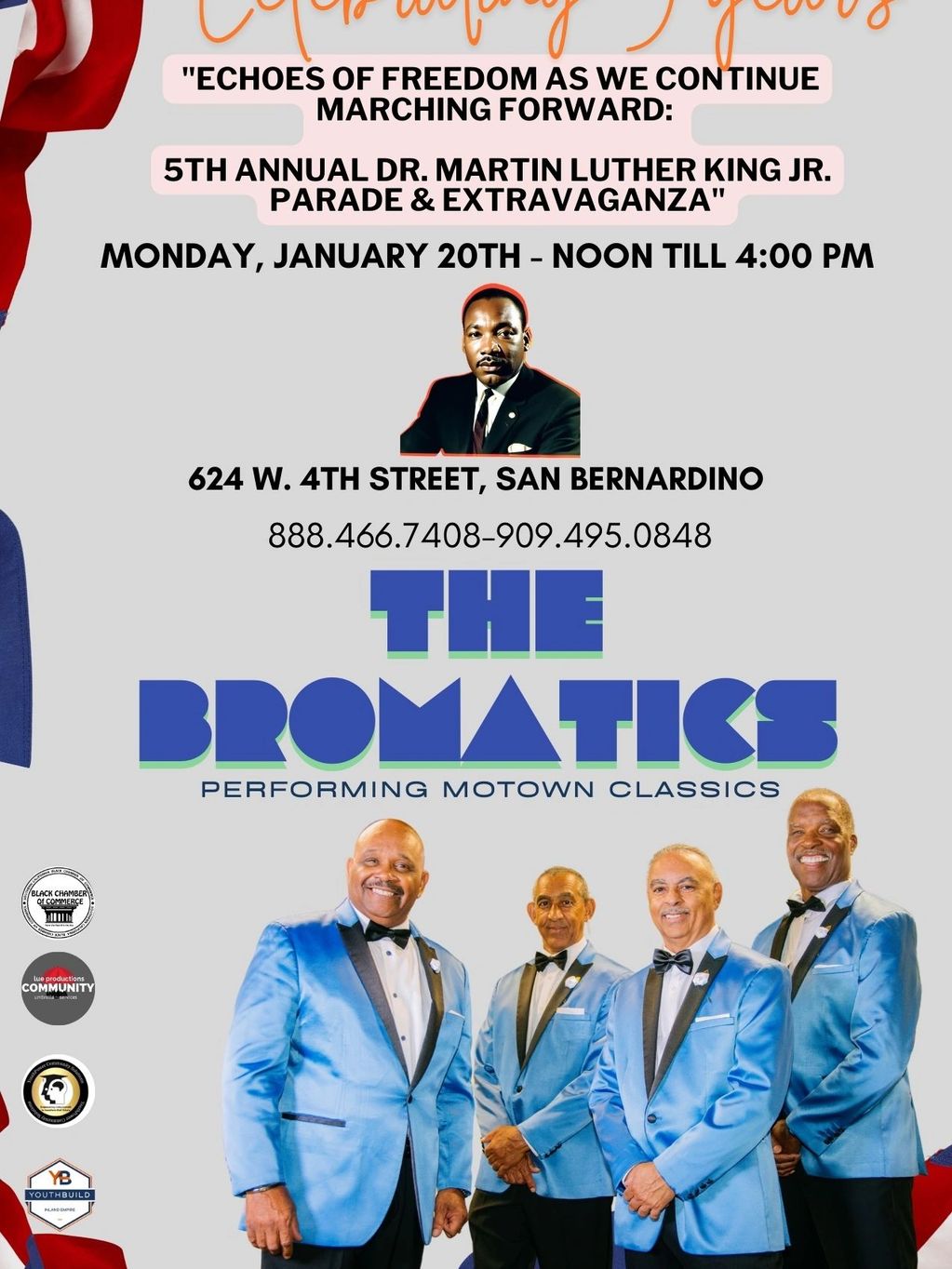 The Bromatics performing live Monday, January 20th at the San Bernardino MLK Day Parade and Extravaganza. Come out for this free community event and get your groove on with us THE BROMATICS!